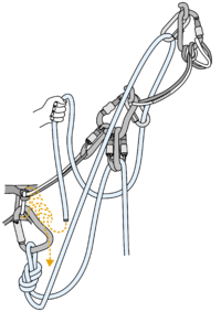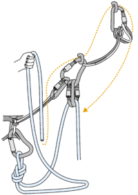 This method is forbidden by climbing associations in some countries and places.[1] The ban is due to an increased bolts and fixed rings abrasion which leads to unnecessary and undesired shortening of the material replacement cycles. For example at traditional sandstone routes which are (due to a tradition) almost exclusively equipped with fixed rings, it would mean additional drilling into a rock which is often protected by a law due to nature preservation for further generations.[2] In addition, this method cannot be used for lowering directly from hanger plates as the friction over the plates edges would severely damage the rope.